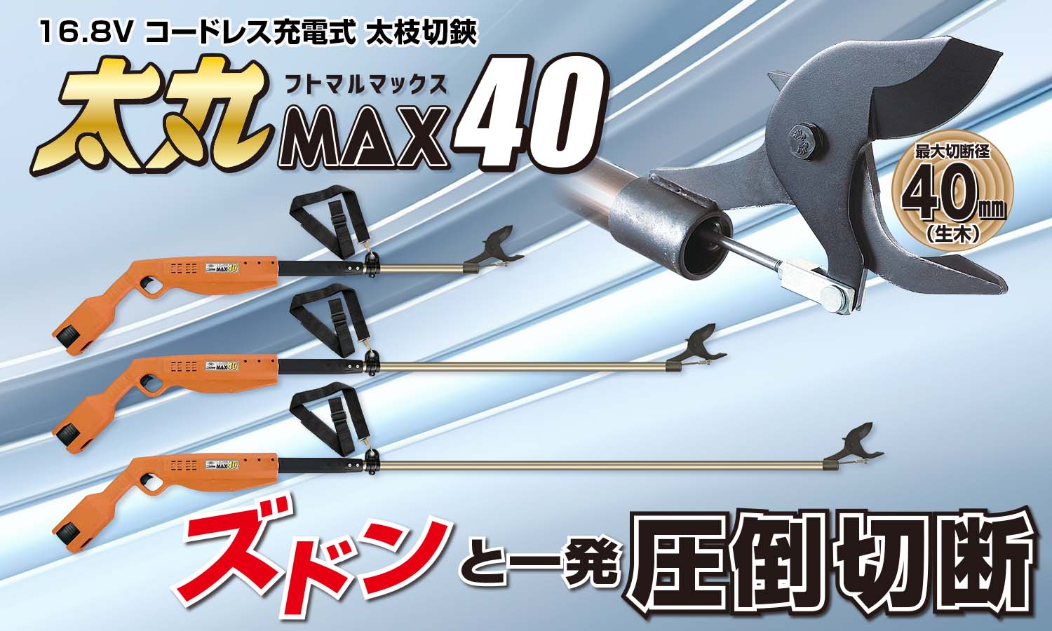 日頃は弊社製品をご愛顧いただき誠にありがとうございます。 太丸MAX40を発売いたします。 【太丸MAX40】 コードレスによる取り回しの良さと、40㎜までの太枝を1秒※でカットできるハイパワー仕様を両立。※1サイクル2秒 また、疲労を軽減する肩掛けベルトや、高所を狙いやすいピストル形状細身グリップで快適に作業ができます。 用途に合わせて選べる長さ3タイプをご用意しました。 詳しくは製品ページをご覧ください。 【概要】※4月21日発売予定 1.0Mモデル 全長1080mm/重量約2.1kg (バッテリー・充電器付) 定価76,340円(税込)/ (本体のみ) 定価62,150円(税込) 1.5Mモデル 全長1580mm/重量約2.3kg (バッテリー・充電器付) 定価77,000円(税込)/ (本体のみ) 定価63,030円(税込) 2.0Mモデル 全長2080mm/重量約2.6kg (バッテリー・充電器付) 定価79,750円(税込)/ (本体のみ) 定価65,670円(税込) ●本件に関するお問い合わせ メールでのお問い合わせ:sales@ni-co.jp ホームページ内のお客様サポートからお問い合わせ頂けます。 https://ni-co.jp/ec4/contact 電話でのお問い合わせ 電話:0794-82-1000 電話受付時間:8:00~12:00 13:00~17:10 (日、祝、弊社休業日は除く)