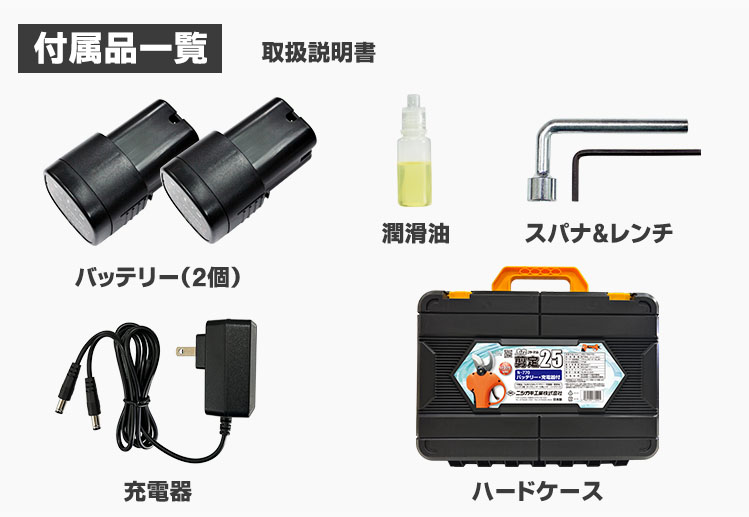 付属品 | バッテリー(2個)、充電器、潤滑油、ボックスレンチ、六角レンチ、ハードケース |